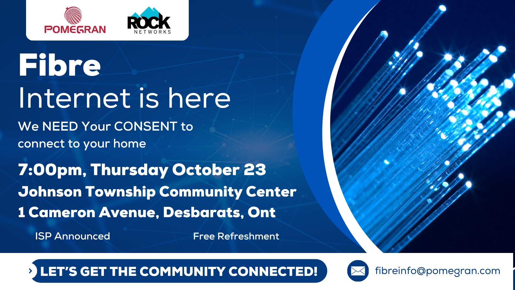Fibre Internet is coming to Johnson Township Spring 2026. If you want to learn all about how to get Fibre into your home join PomeGran & Rock Networks on Thursday, October 23, 2025 at the Johnson Township Community Centre from 7pm-9pm upstairs in the Banquet Hall. Company representatives will be onsite to help you understand what you need to do to prepare your home for Fibre.